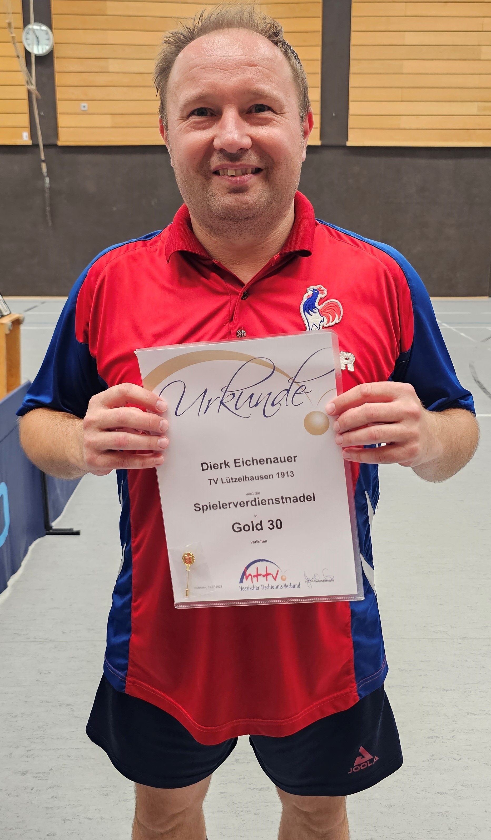 Torsten Bohländer ist seit 1984 aktiver Tischtennisspieler und seit 2019 Spieler beim TV Lützelhausen. Im Rahmen des Neujahrsturniers des TVL bekam er deshalb die Spielerverdienstnadel Gold40 des Hessischen Tischtennisverbandes (HTTV) verliehen.